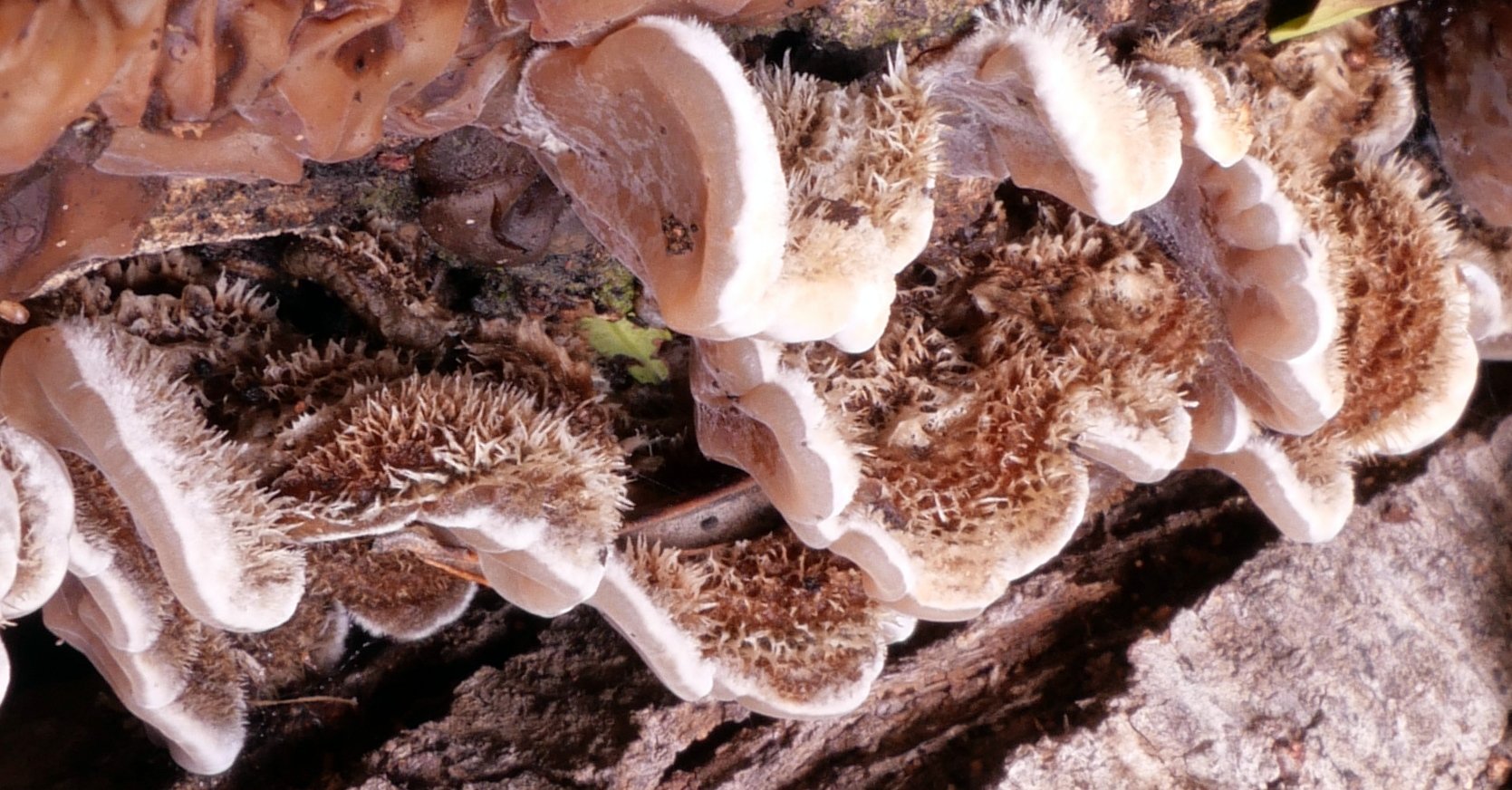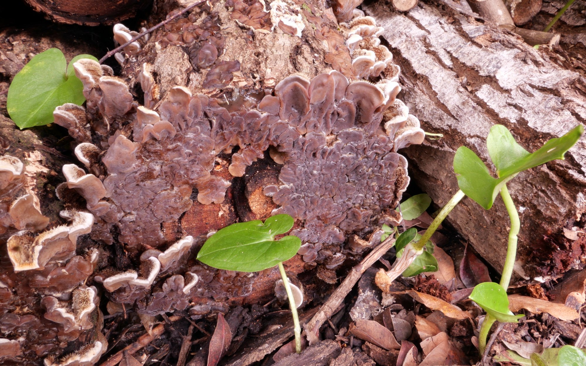 Jeunes exemplaires, en partie résupinés, sur vieux noyer abattu. Arconsat (63). Autres photos sur ce sujet.
