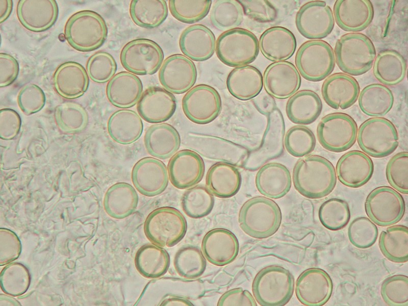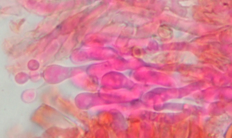 hyphes et basides spatulées tétrasporiques, non bouclées, spores globuleuses à apicule sans réaction dans le melzer