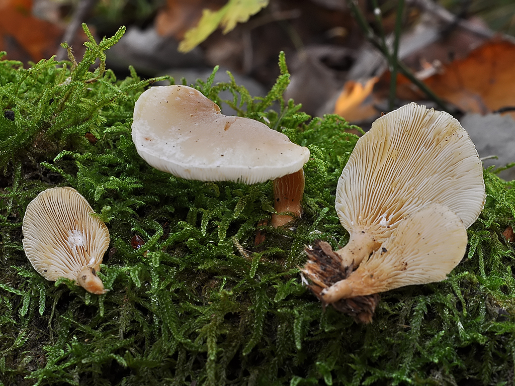 Sur bois de feuillu apparemment, spathuloïde, environ 5 cm de long pour les plus gros, 2-3 cm de large; lames assez serrées, décurrentes, blanchâtres; chapeau mince, grisâtre, à pellicule non détachable, plutôt mate; stipe latéral court, brun orangé très pâle; chair blanchâtre, sans odeur particulière. 6-7 individus en groupe.