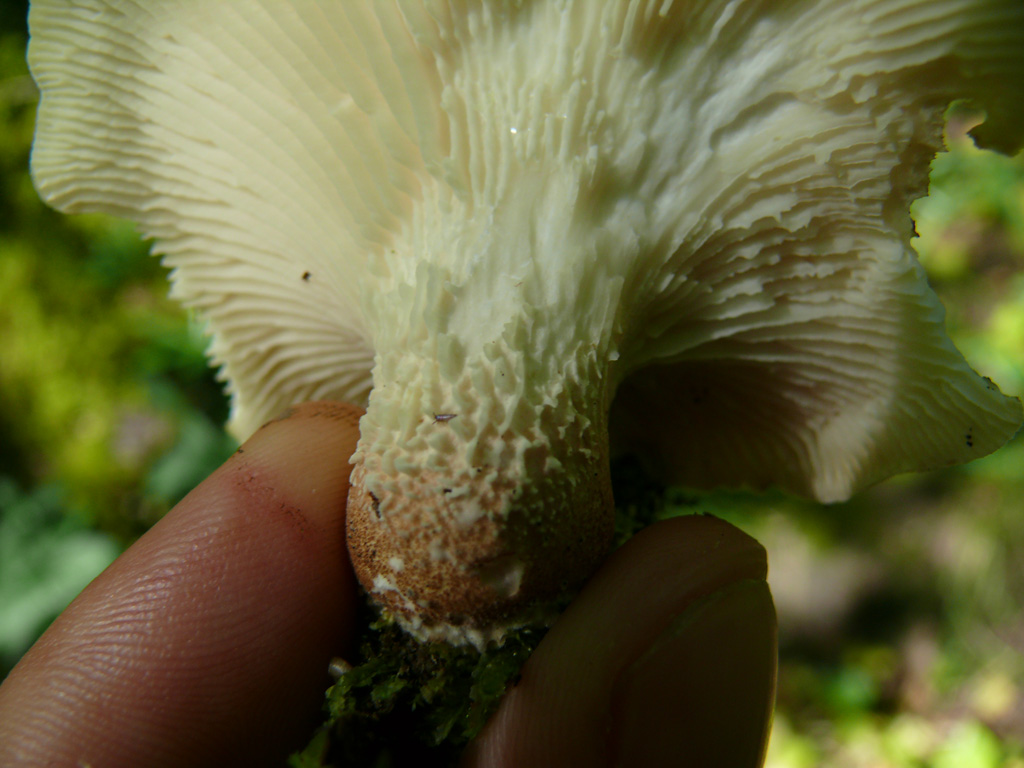 trouvé ce jour ce champignon. exemplaire isolé au pied d'une buche dans une foret de feuillus. le stipe est cour et les lames imposantes un peu comme chez une pleurote. je n'ai pas trop d'idée. quelqu'un saurait il m'orienter ?