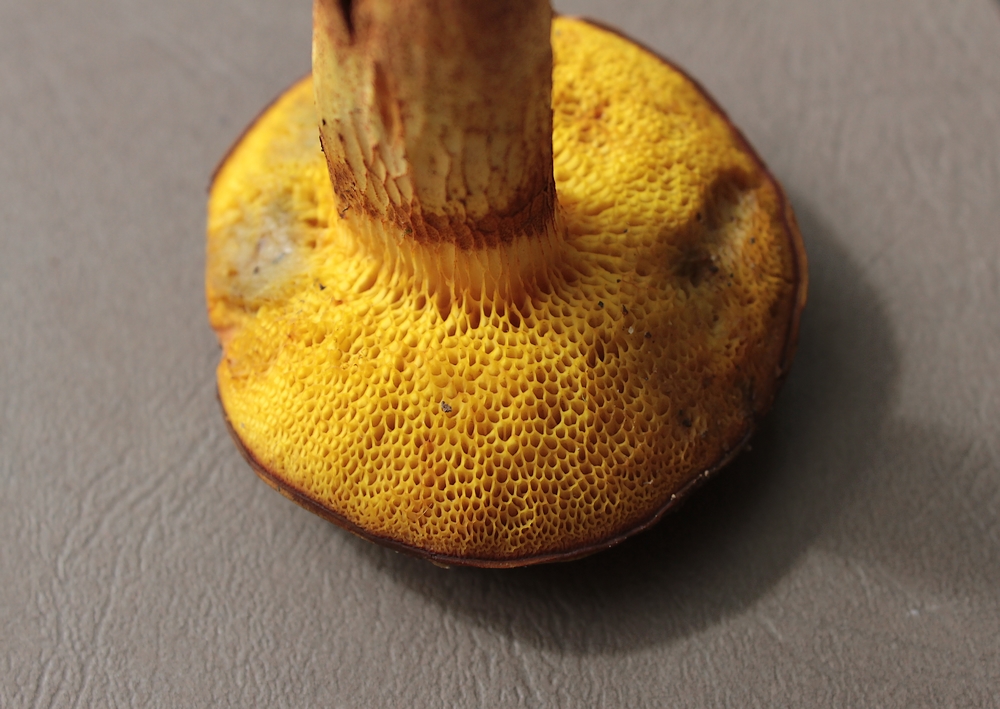 Tubes jaunes, légèrement bleuissants, décurrents sur le pied, pores amples d'un beau jaune vif.