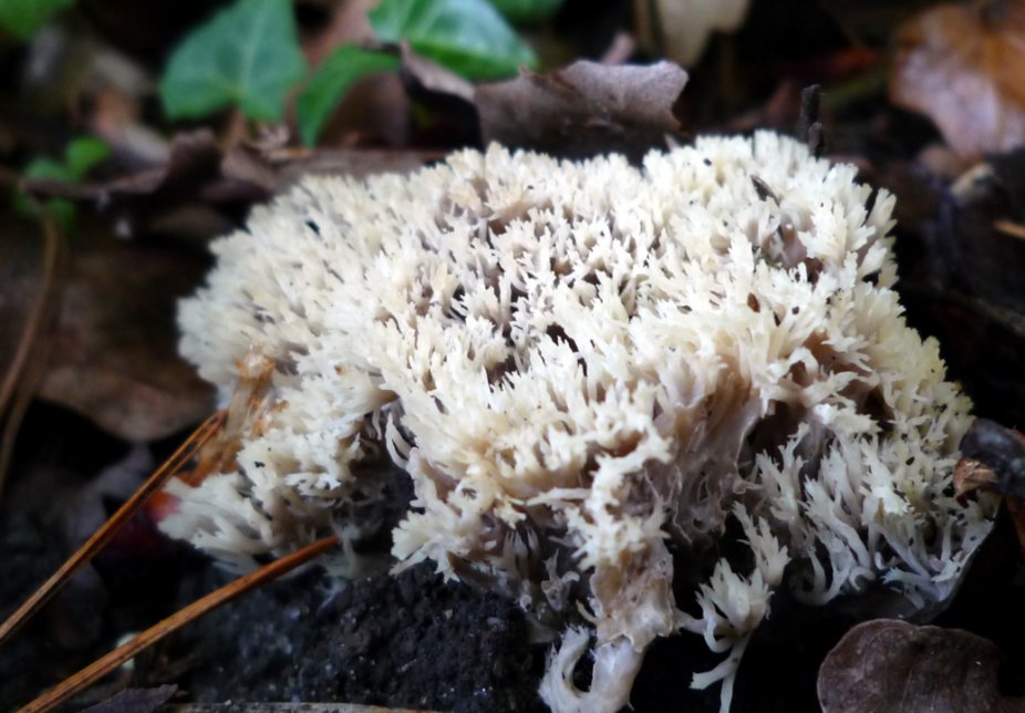 Il me semble qu'il s'agit bien de Clavulina cristata, les tons gris et les ponctuations noires que l'on voit çà et là sont certainement causés par Helminthosphaeria clavariarum. C. cinerea n'a pas les extrémités aussi ramifiées et déchiquetées que chez sa cousine.