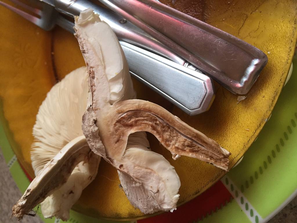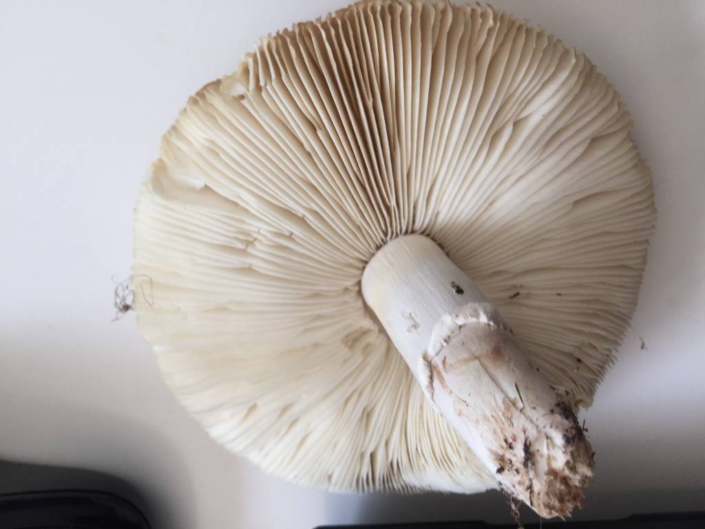 Le pied: droit, cylindracé, il semble avoir quelques stries longitudinales peu marquées et il a un anneau. Au-dessus de l'anneau le pied est blanc sauf sous les lamelles où il y a une zone jaune clair. L'anneau est étroit, comme enroulé, il ne semble pas coulissant. Sous l'anneau le pied est blanc sale teinté de rosé. Le pied se termine très mal. Il devrait y avoir un bulbe. Selon mon fils il ne restait rien sur le sol et en même temps je me dis que s'il y avait eu un bulbe il serait venu avec le pied (à moins que la chair soit en décomposition)