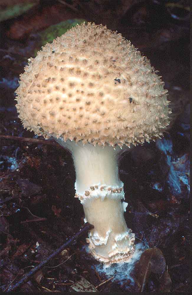 Avec ce chapeau hérissé, je me tourne vers le genre Echinoderma. Je devine la formation d'un futur anneau membraneux garni de flocons... Ne voyant pas la densité des lames j'hésite entre Echinoderma asperum et Echinoderma perplexum (qui est plus petit).