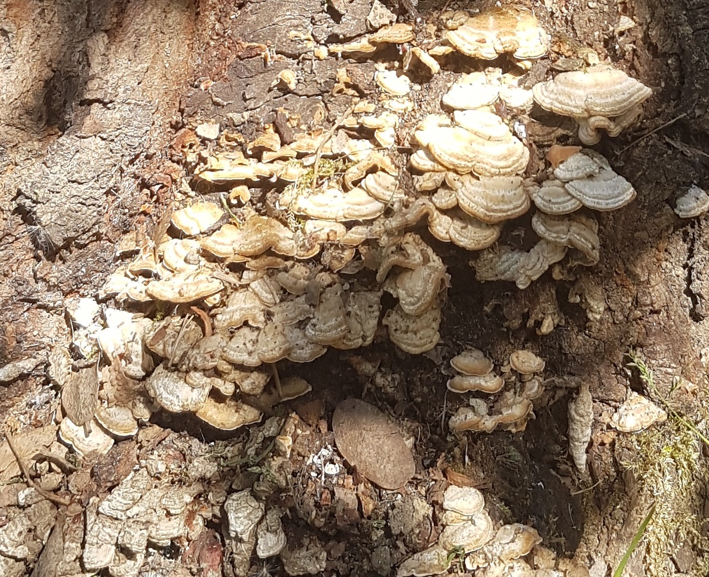 J'ai remarqué à la base d'un eucalyptus le groupe de champignons visibles ci-dessous.