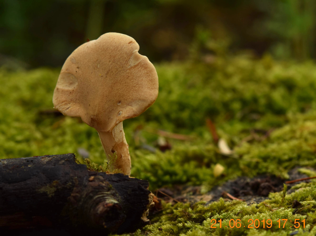 Je ne reconnais par vraiment ce petit polypore greffé sur branchette. pied excentré, 7cm de haut et 4 de large. Chapeau concolore au pied de couleur orange, finement feutré, pores minuscules. Odeur insignifiante et saveur douce. Ce qui se rapproche le plus serait