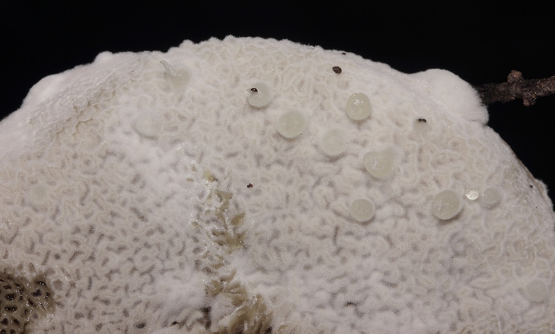 au cas où, voici un magnifique feutrage mérulloïde envahissant un xerocomus type chrysenteron/pruinatus.. j'ai bien tenté une micro, mais rien vu de particulier à part des fibres..
