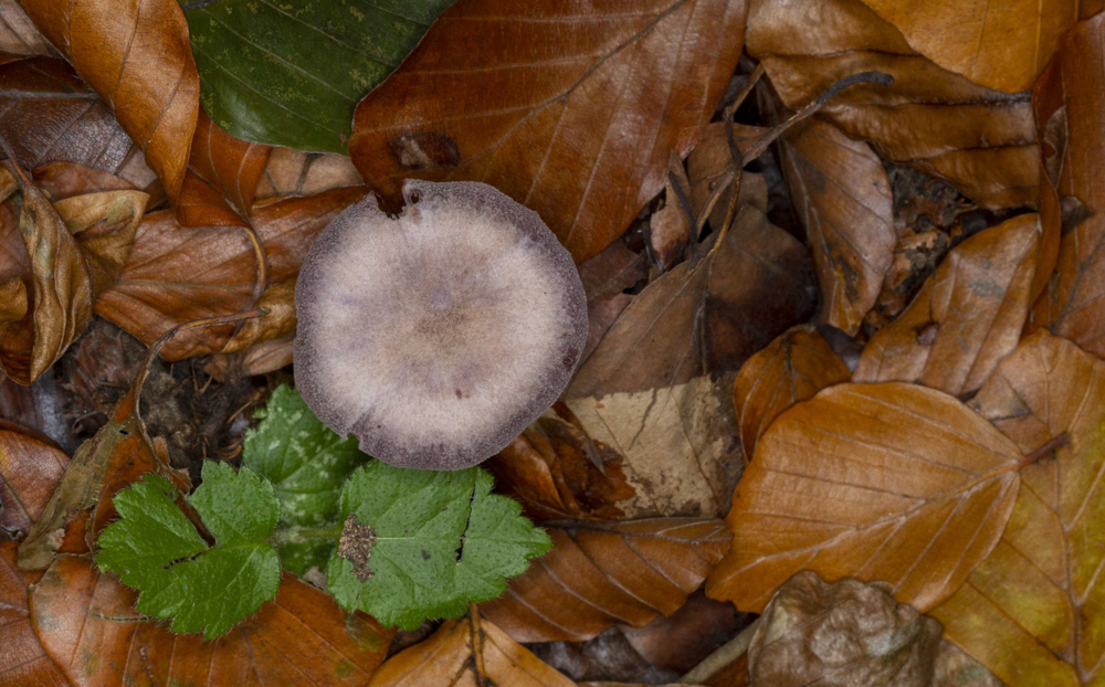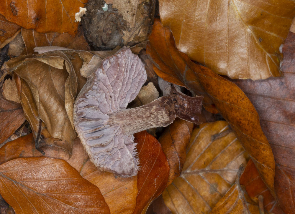 Toujours en forêt de Soignes (hêtres et chênes), un champignon violet pâle (chapeau et lamelles).