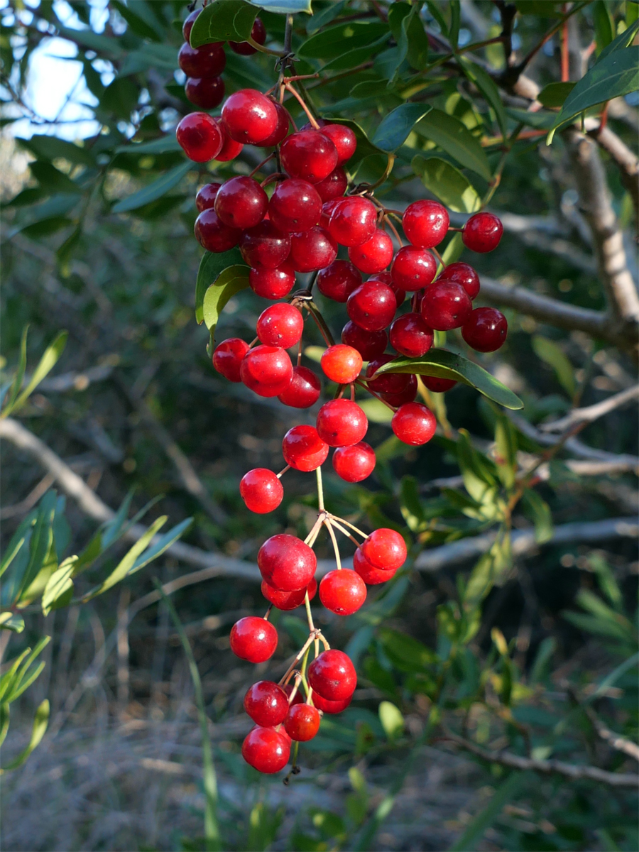 Curieusement on pourrait croire qu'il s'agit de la même grappe qui aurait mûri, ce qui n'est pas le cas, les photos sont prises sur deux buissons différents à une semaine et un km d'intervalle. Mais dans ces contrées où il ne gèle jamais, les éclosions dépendent surtout des pluies et il est fréquent de voir des fleurs et des fruits en même temps et en hiver (les agrumes), l'exemple le plus curieux étant l'arbousier qui a un cycle d'un an : en janvier on voit souvent sur le même rameau les fleurs de l'année et les fruits nés des fleurs du précédent janvier.