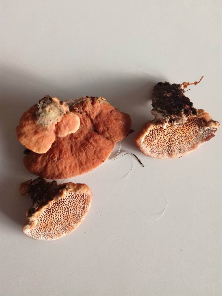 Il y a trois choses à observer macroscopiquement pour les différencier : la forme du basidiome, la plante hôte et le nombre de pores par mm. Je pense qu'il s'agit, en dépit du nombre assez faible de pores par mm, d'Hapalopilus rutilans.