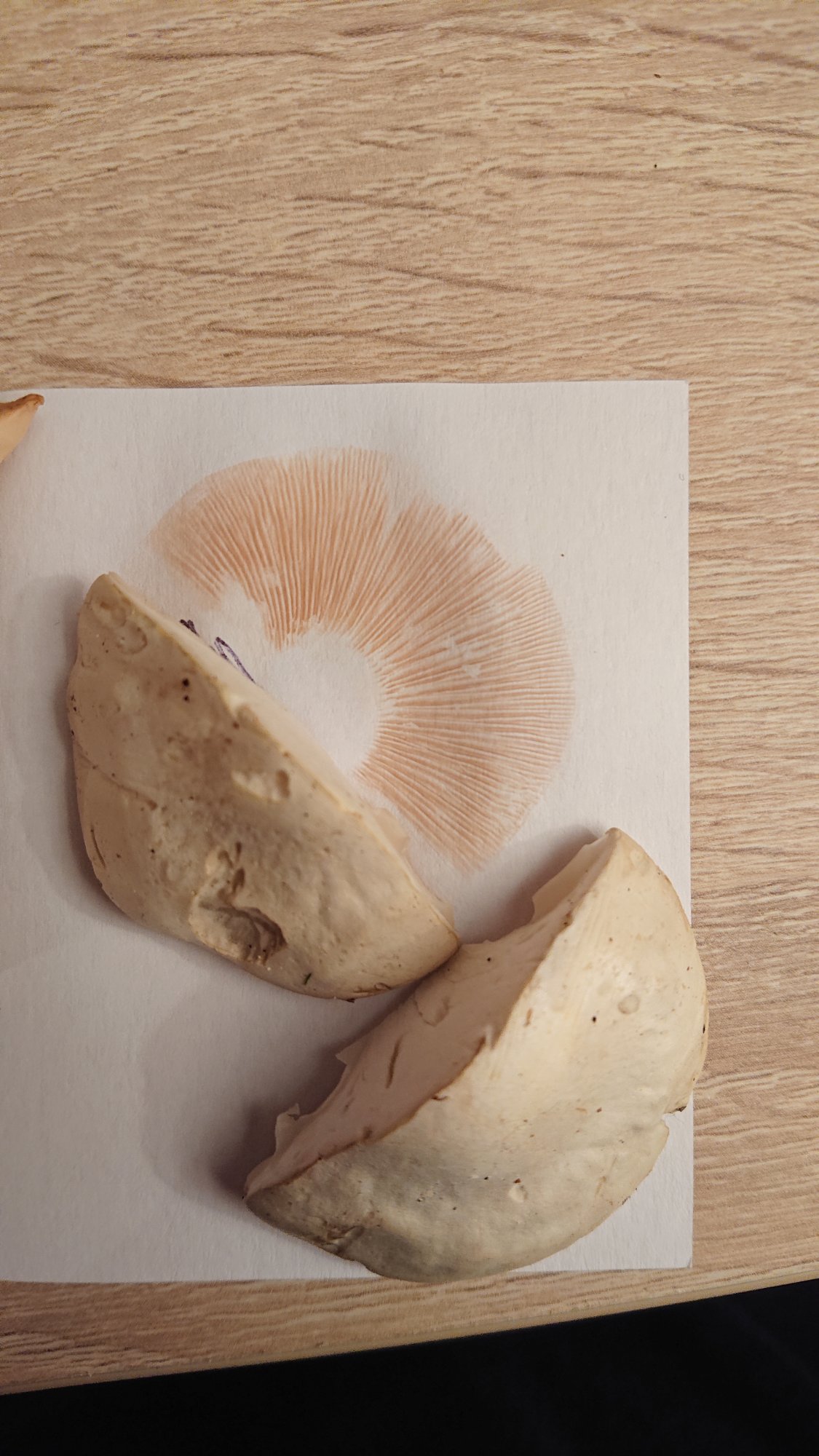 Chapeau de 4 cm de diamètre, pied de 5 cm environ, à marge légèrement enroulée, lames blanc crème, chair blanche. Un probable clitocybe, donc. J'ai vu que l'odeur était assez importante pour distinguer les espèces, mais hélas, ce n'est pas mon fort. La sporée légèrement rosée et le pied légèrement cassant laissent envisager un Meunier (Clitopilus prunulus), mais comme je n'ai jamais rencontré cette espèce connue, je préfère m'en remettre à vos lumières.