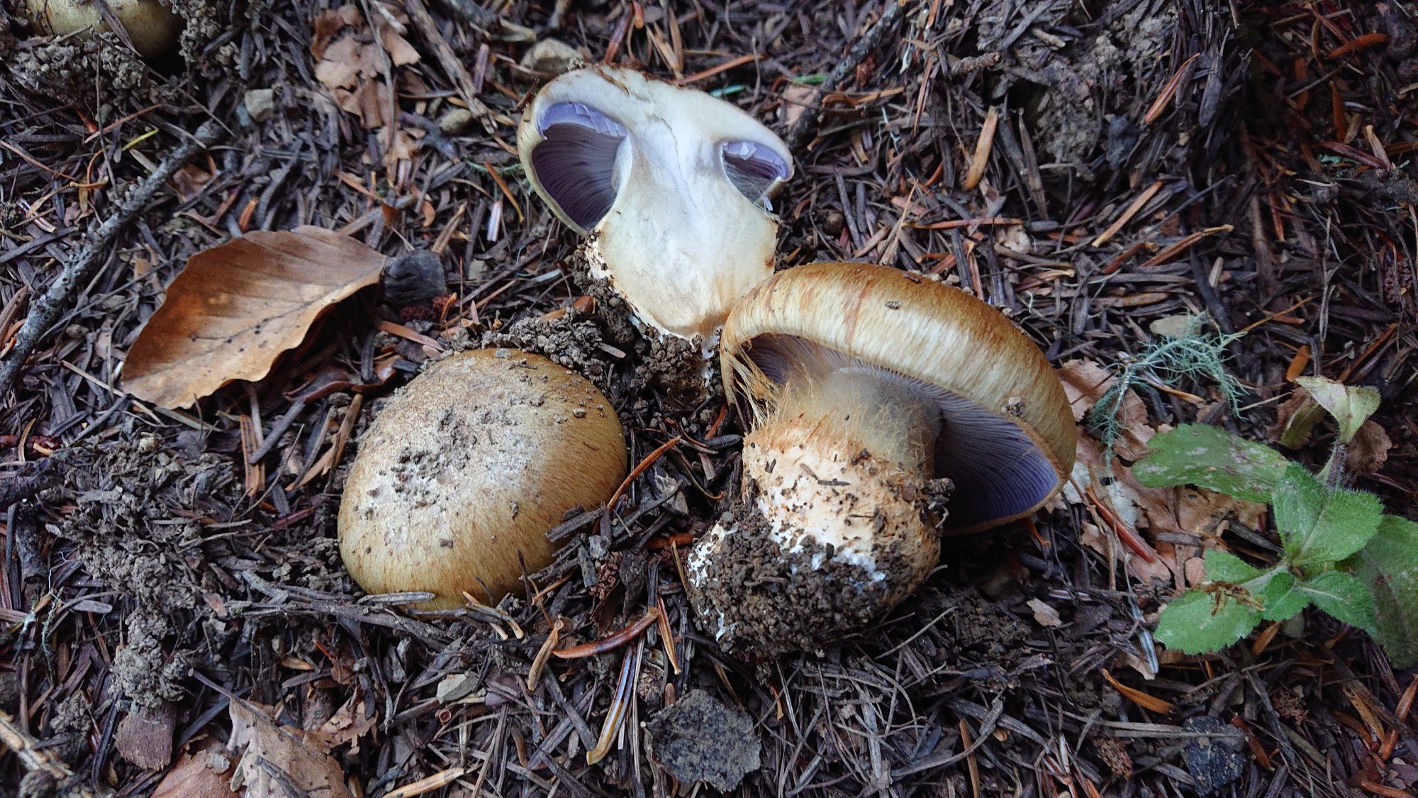 Je précise que j'ai utilisé le GEPR3. Je me suis dirigé vers la section des cortinaires à bulbe marginé (et à chapeau sans doute visqueux, même si ça ne se voit pas). Je lui trouve une odeur assez nette mais que je ne parviens pas à décrire... Je n'opte cependant pas pour les espèces odorantes car elles ne semblent pas avoir les lames bleues. J'opte donc pour la section à tons bleus, et ensuite pour les chapeaux à tons différents (ni blancs, ni bleus, ni verts, ni jaunes). Sous conifères, j'aboutis à C. fulvoochrascens, qui ne correspond pas du tout...
