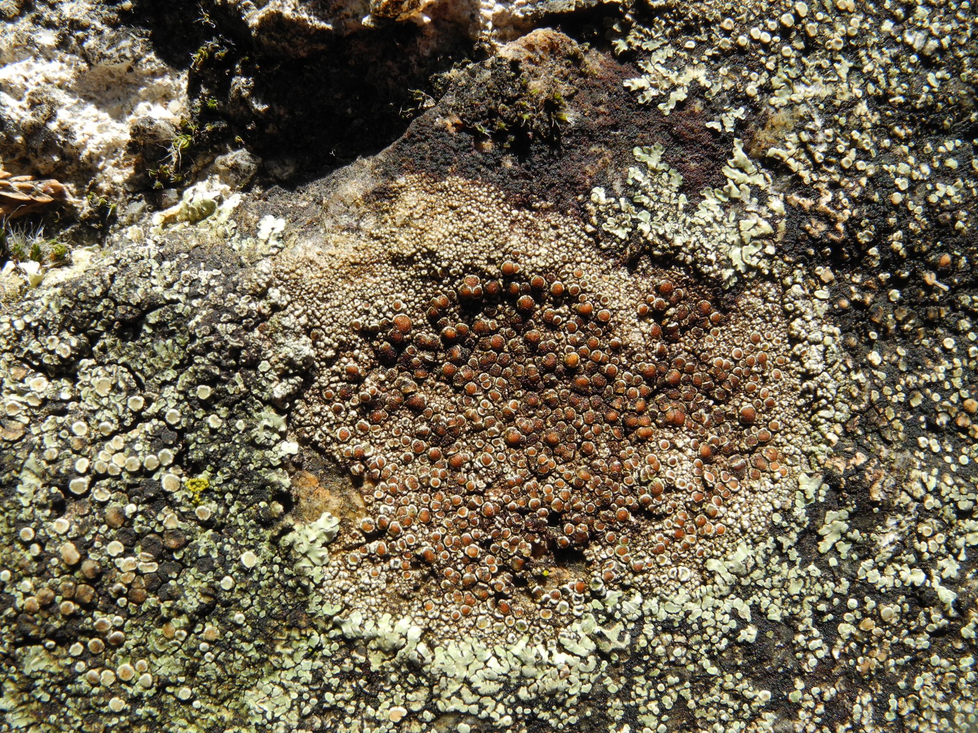 Lecanora ? Peut-être pas campestris (les apothécies sont bien rouge-orangé, pas noires) mais autre chose dans le style ? C'est à voir ...