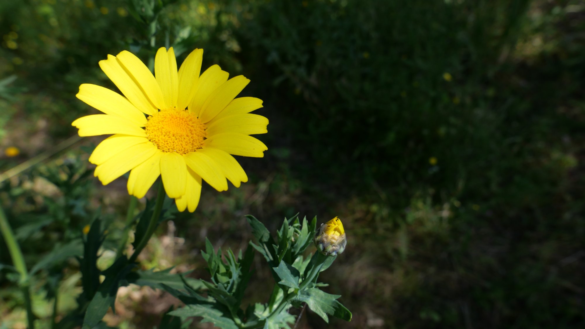 Sans concurrencer le très abondant chrysanthème de Mykonos, cette marguerite jaune, nettement plus grande (hauteur jusque 80 cm, diamètre jusque 6 cm) et à feuilles découpées, est apparue dans notre terrain et le maquis proche. Possiblement une échappée des jardins, encore que peu de jardins nous entourent. Pouvez-vous me dire son nom ? Palombaggia les 17 et 31/03/21 :
