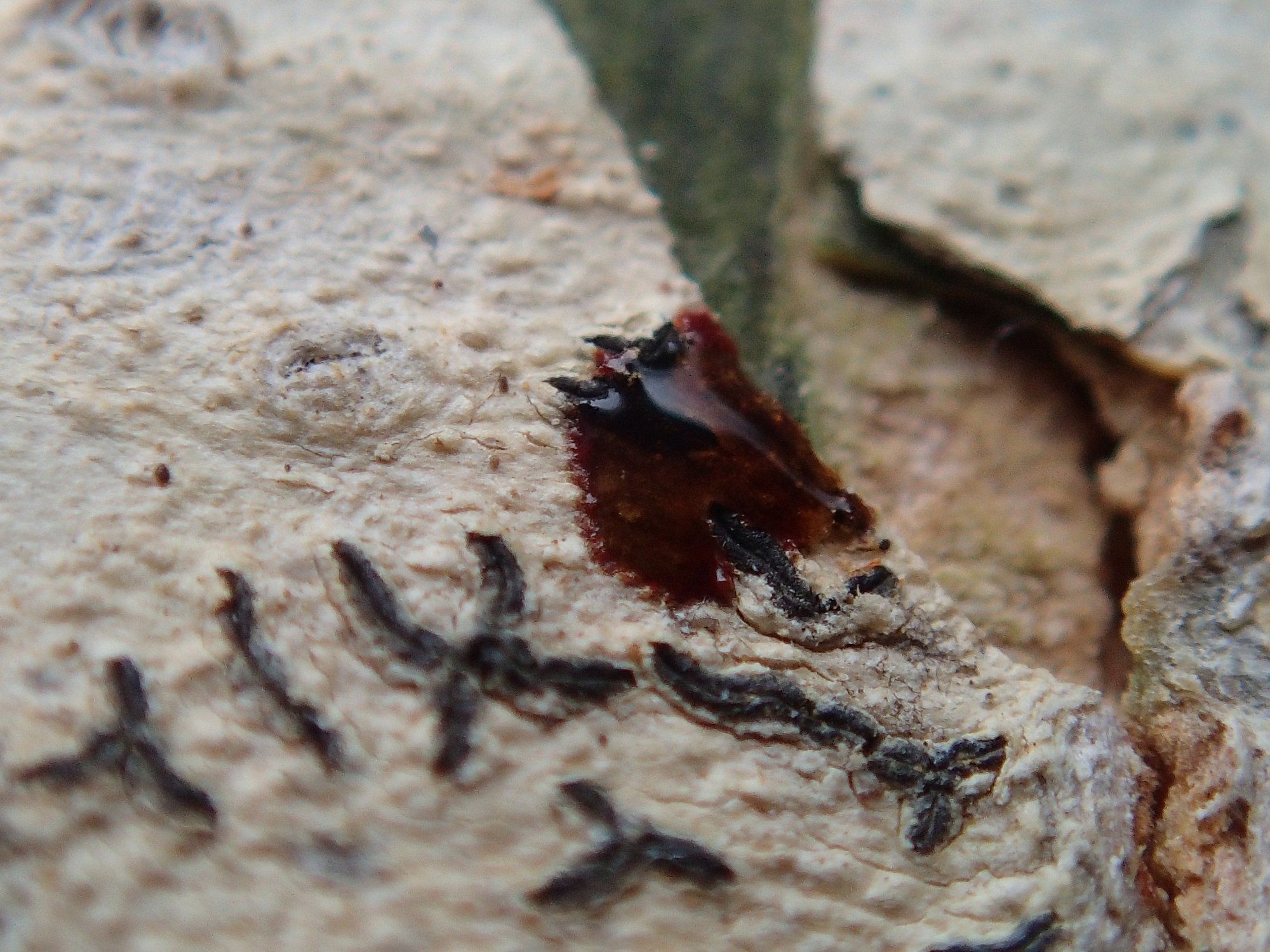 Pour le coup, il est très fréquent que l'épithécium soit coloré en brun, noir, vert etc... Par contre j'ai pas la raison.
