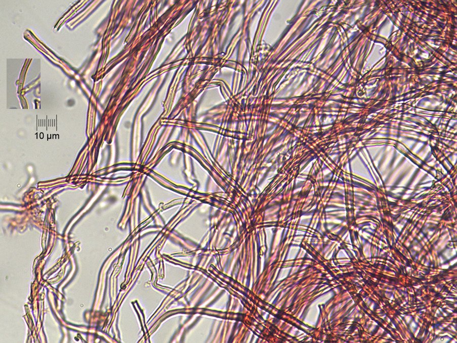 Sytème hyphique dimitique composée d'hyphes squelettiques nombreuses à paroi épaisse non cloisonnée et d'hyphes génératrices bouclées, peu nombreuses.