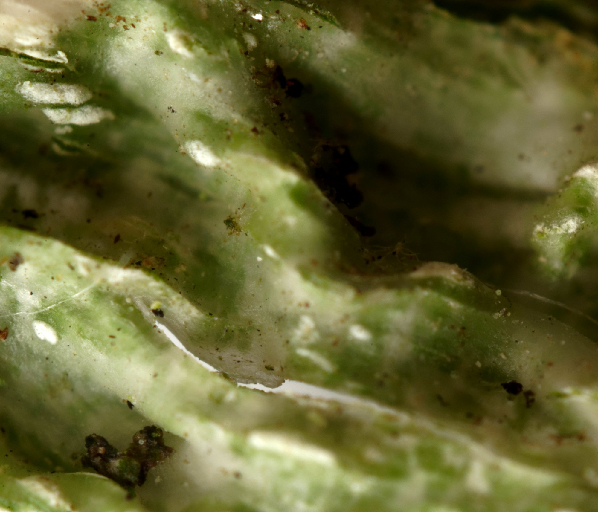 Voici une photo générale, un détail et une macro. Le thalle avait été un peu humidifié pour faciliter son étalement (c'est plus pratique) mais il est bien gris quand il est sec.