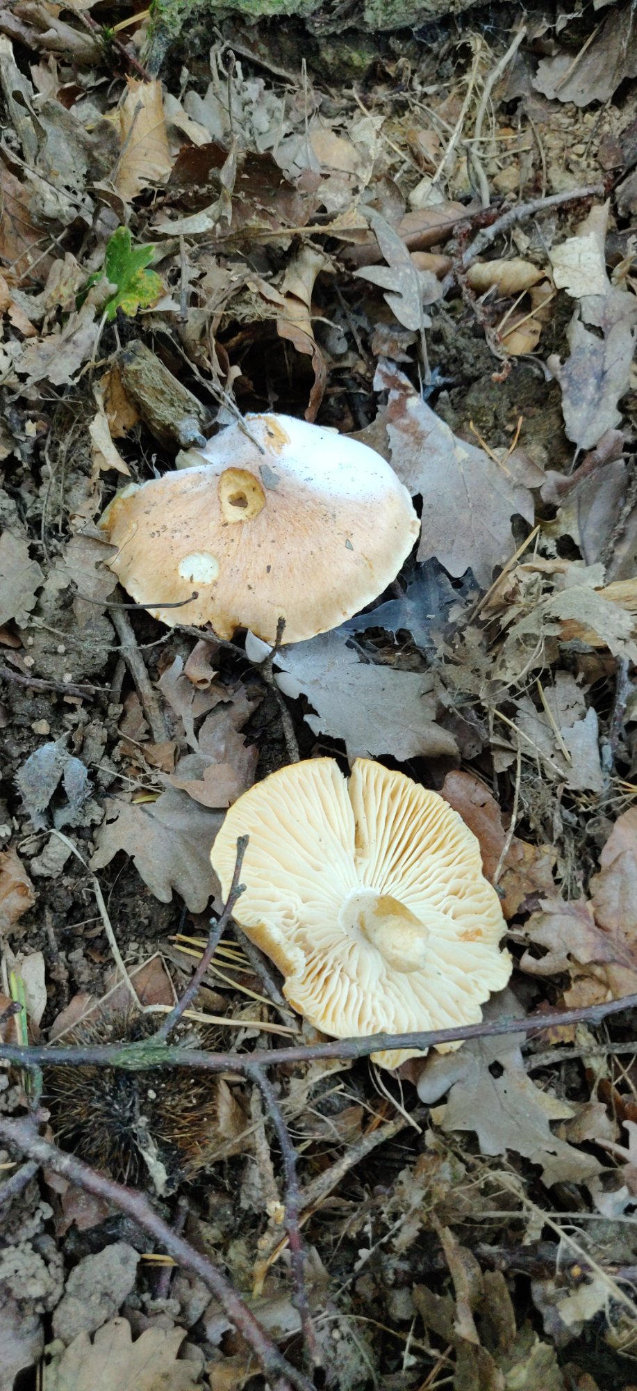 Chapeau orange pâle de loin j'ai cru voir des pied de moutons. Un peu plus foncé au centre