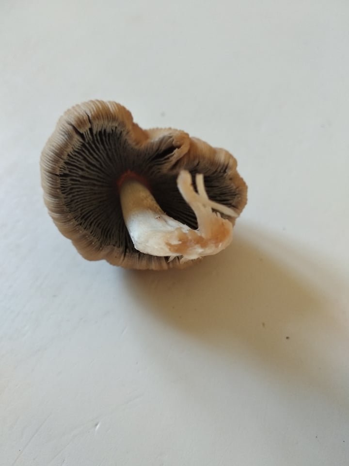 Les champignons me semblent de couleur marron-beige, dégradée du haut du chapeau jusqu'aux bords de plus en plus clairs ; une queue blanche ; des lamelles vert-de-gris. Le chapeau est légèrement strié. Ils ont poussé bien amassés, avec quelques spécimens isolés.
