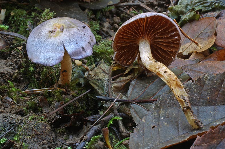Le profil des lames varie beaucoup pendant la croissance. de plus, il s'agit ici (hélas) d'un vieux sujet dont la cpouleur a déjà passé. On reconnait facilement ce myxacium à son chapeau mauve bleuté, et son jaunissement important ; ce qui lui a valu son nom. c'est de plus un petit myxacium. Chose rare pour les myxacia colorés.