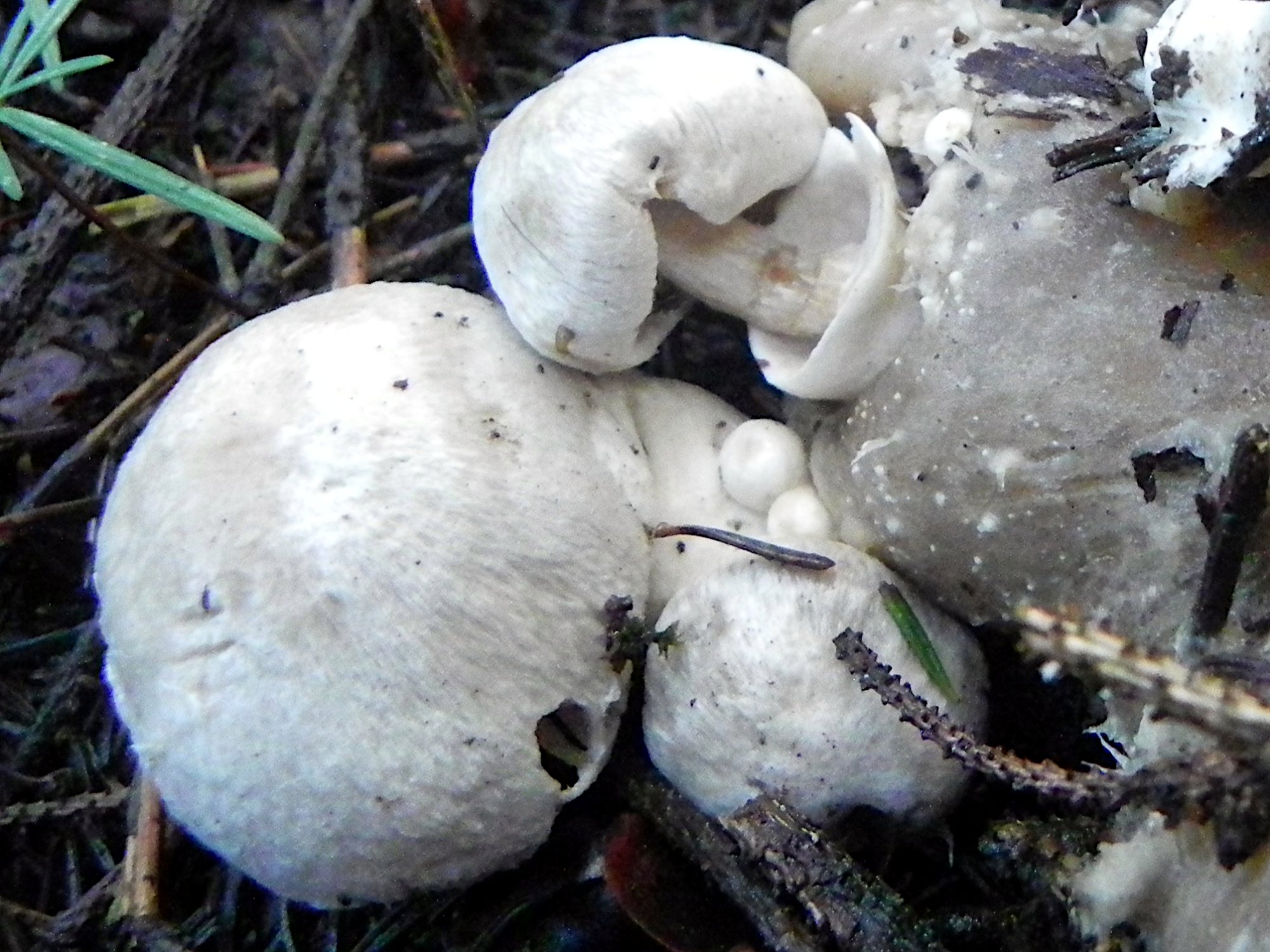 Cette Volvaire qui parasite les cadavres de Clitocybe nébuleux est aussi belle que la laideur de son substrat.
