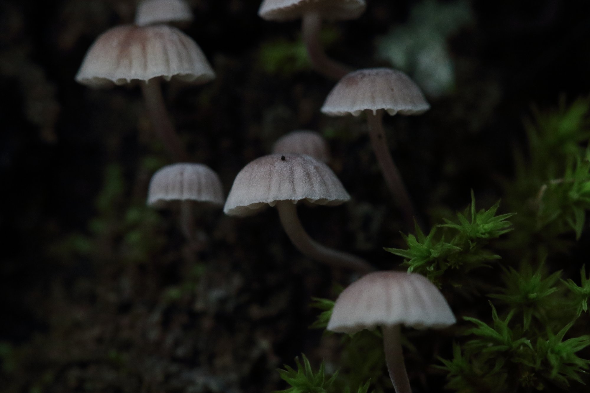 Les photos suivantes sont un peu plus contradictoires. Elles sont prises hors contexte dans des conditions plus lumineuses qui font ressortir des nuances de gris-rose se rapprochant davantage de Mycena meliigena.