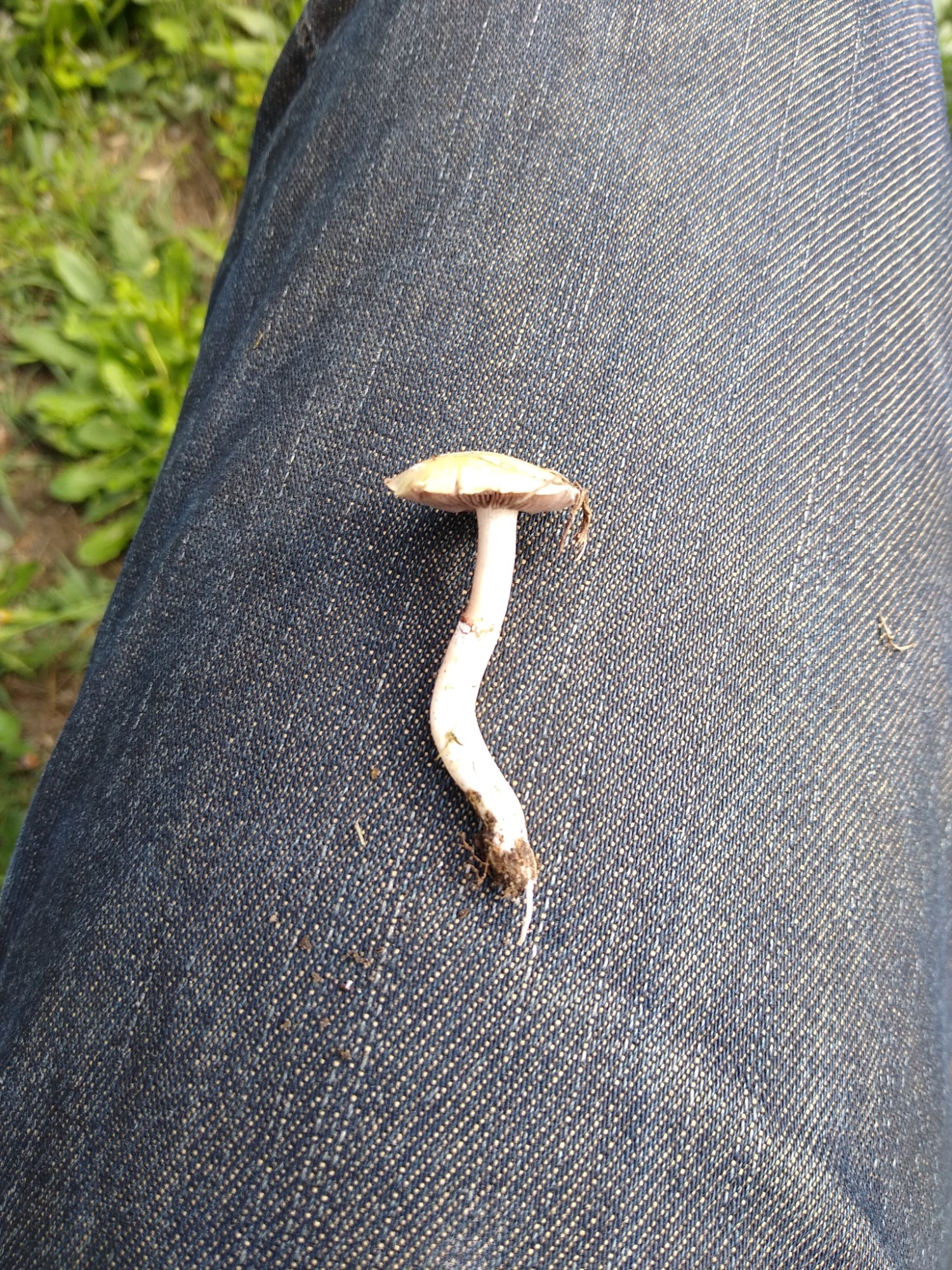 Chapeau : entre 3 ou 4 cm de diamètre, un peu sec, jaune pâle, il me semble voir des restes de voile sur sa marge.