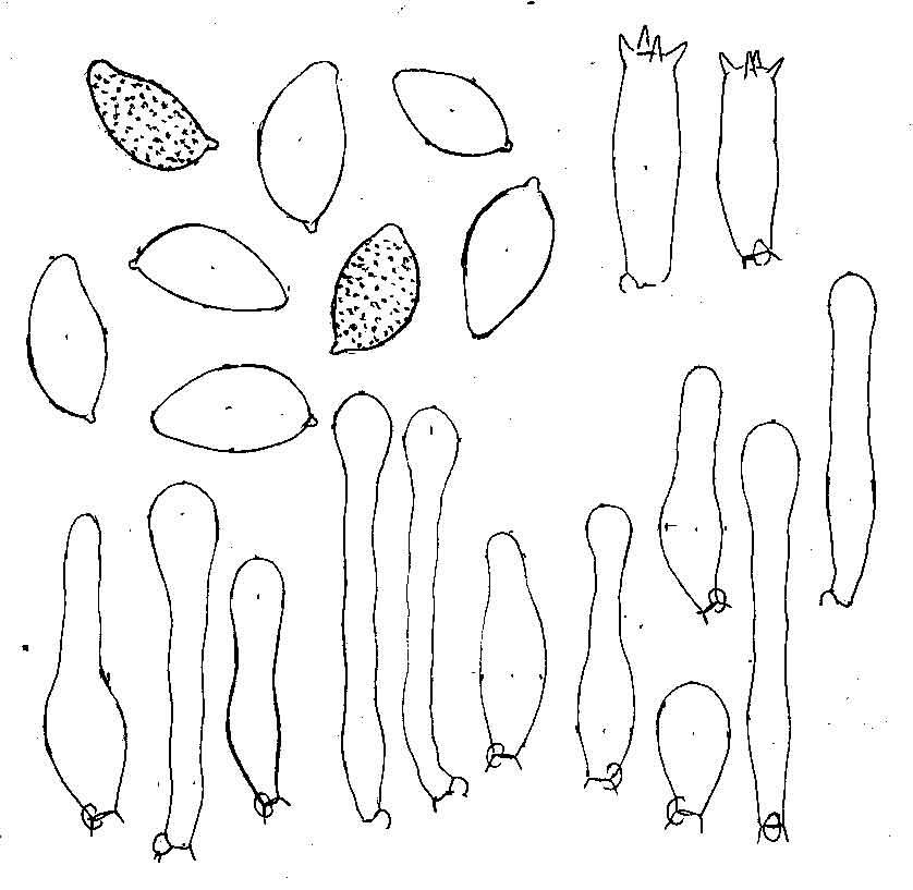 Spores 9,6-11,3-13 x 5,5-6,2-6,9 µm, Q = 1,6-1,83-2,1, très nettement dextrinoïdes (D3).