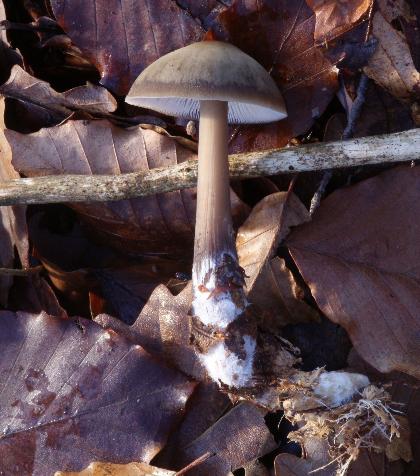 Stipe : 6 cm environ, cylindrique, base incurvée à angle droit, brun, plus clair vers le haut. Base recouverte de mycélium blanc.