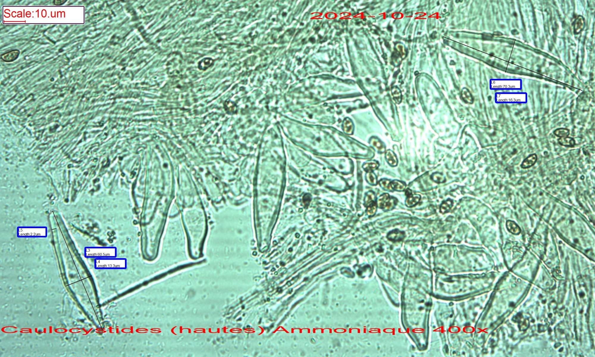 Cheilocystides/Pleurocystides/Caulocystides, assez semblables à sommet peu cristallifère. Profil variable, lagéniforme, le plus souvent allongé.