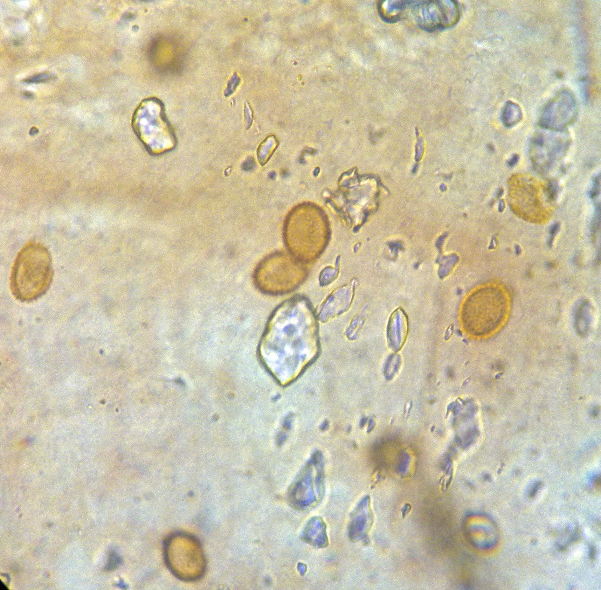 3 micros des spores, la 1 et la 3 sur du matériel frais et la 2ième sur du sec comme tu me l’avais indiqué FOUAD. Les dimensions des spores sont de 8µm – 6µm (sans l'enveloppe). La structure des spores comprend une première membrane verte, puis une deuxième membrane orange et enfin un noyau beige, l’apex est hyalin.