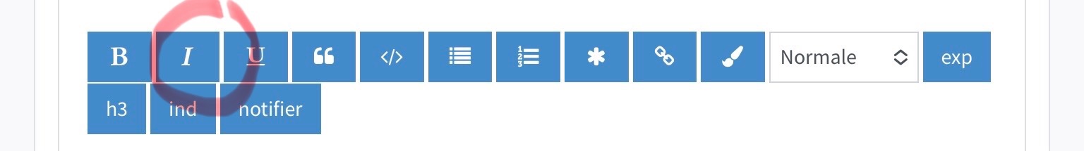 Pour rédiger en italiques, sélectionner le I penché dans le bandeau bleu rédactionnel ou sélectionner la phrase déjà écrite en la surlignant puis cliquer sur le même I.