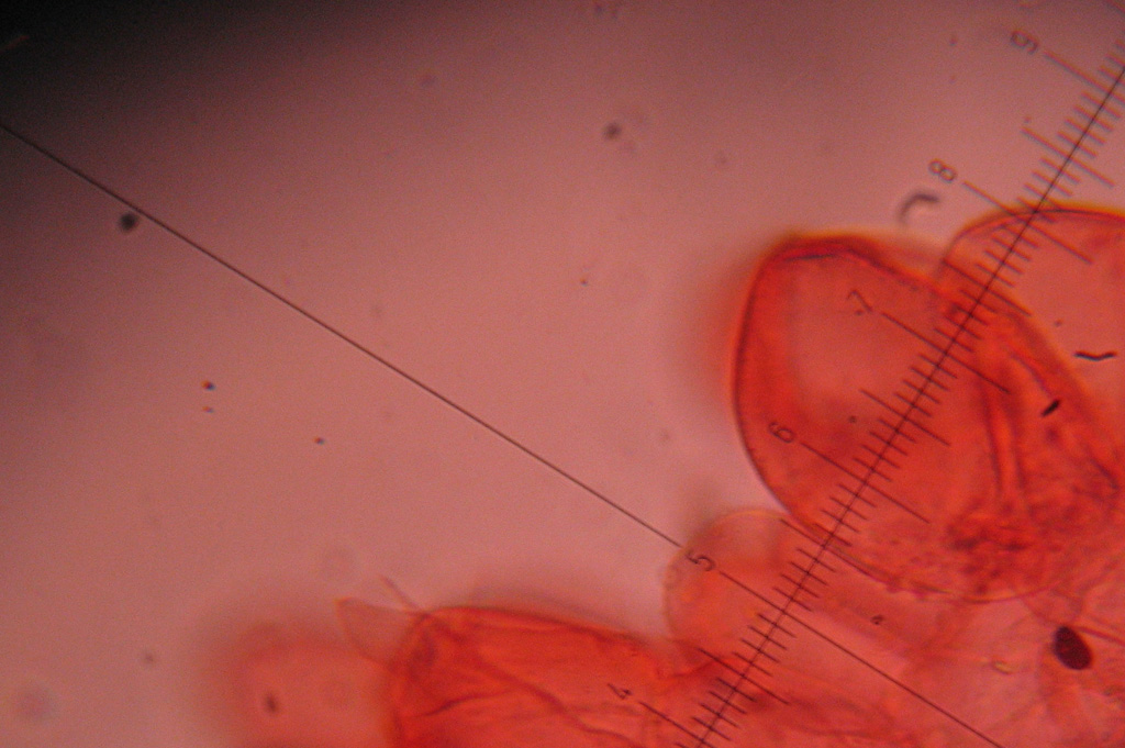voici ce que je vois sur le stipe, caulo ? incrusté... la division du micromètre représente 1.5µm, pas eu le temps d'étalonner.