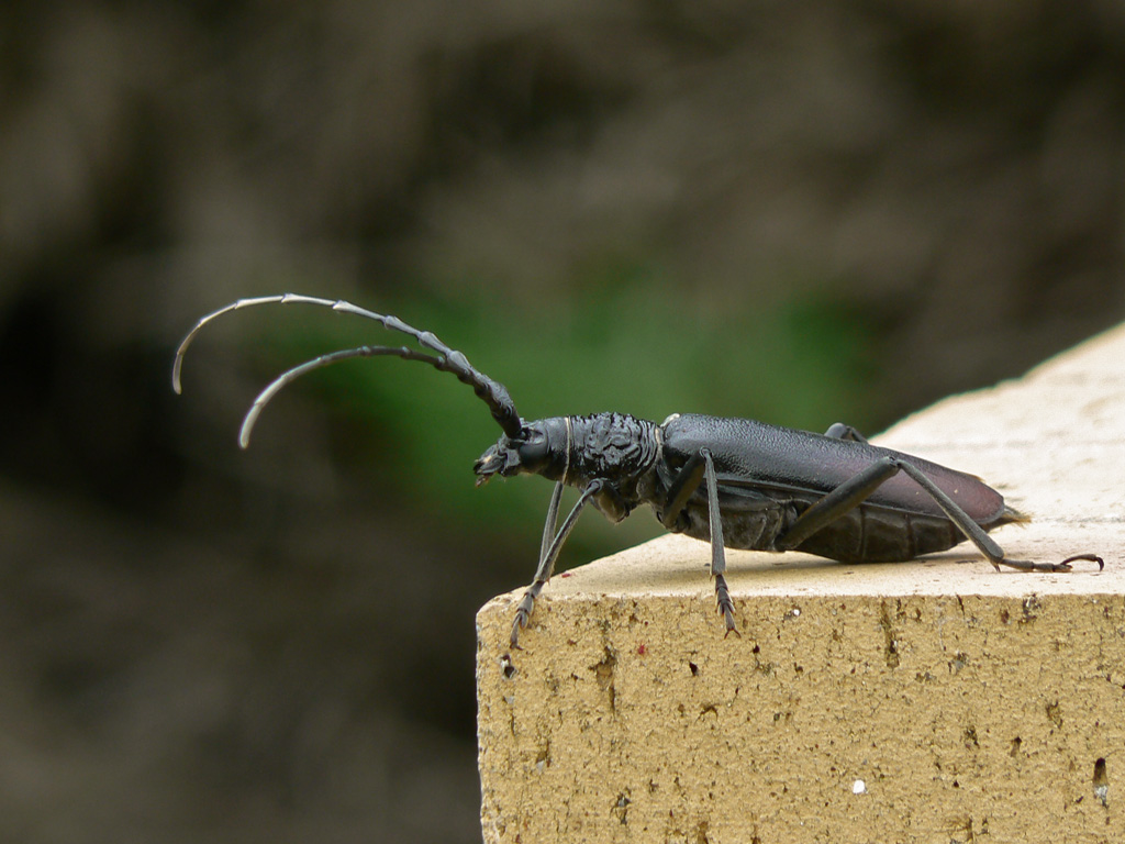 Heureux hasard, j'ai photographié celui-ci il y a moins d'une semaine dans mon jardin. Jolie bestiole de taille très respectable -frisant les 8 cm... sans les antennes !- au point que mon chat s'est laissé intimider ! D'après la taille des antennes, ça doit être une femelle...