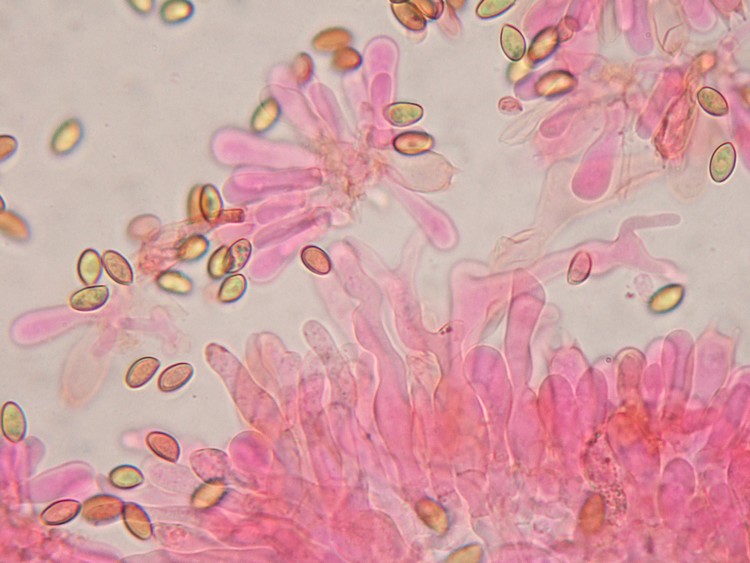 mon problème reste ces drôles de cystides, mais vu la taille sporale <8microns, spore à petit pore germinatif on serait bien à Pholiotina velata = Pholiotina appendiculata