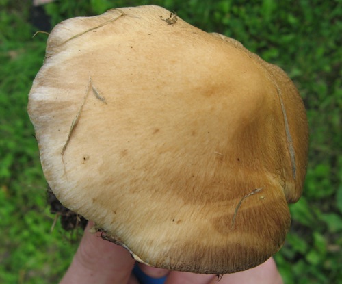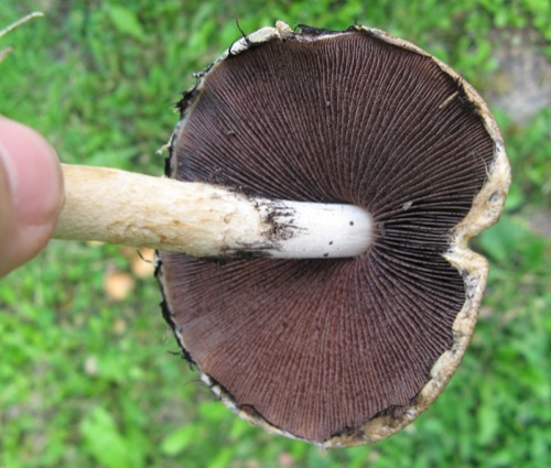 Les lames sont marron foncé, adnées, assez serrées et régulières avec lamelles et lamellules.