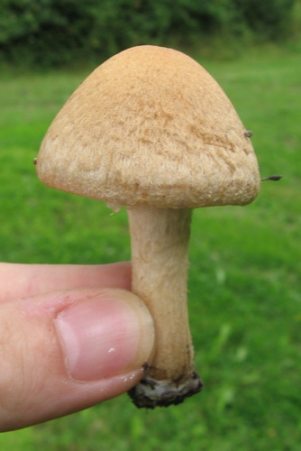 Le stipe, droit, creux, fibreux, très facilement séparable du chapeau, mesure environ 6 cm de haut et présente lui aussi une surface fibrilleuse marron clair, jaune-blanchâtre.